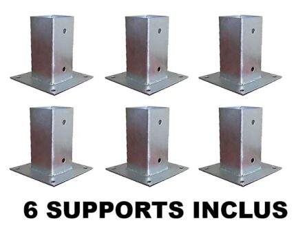 - Im Lieferumfang sind alle für den Aufbau der Holzkonstruktion benötigten Beschläge und Bauteile enthalten. Ebenfalls enthalten sind 6 korrosionsbeständige, verzinkte Stahlpfostenfüße, die sich leicht auf Betonfundamenten befestigen lassen (die passenden Schrauben zur Befestigung der Holzpfosten an den Stahlfüßen sind ebenfalls enthalten. Ankerbolzen zur Verankerung der Füße im Boden sind separat erhältlich).