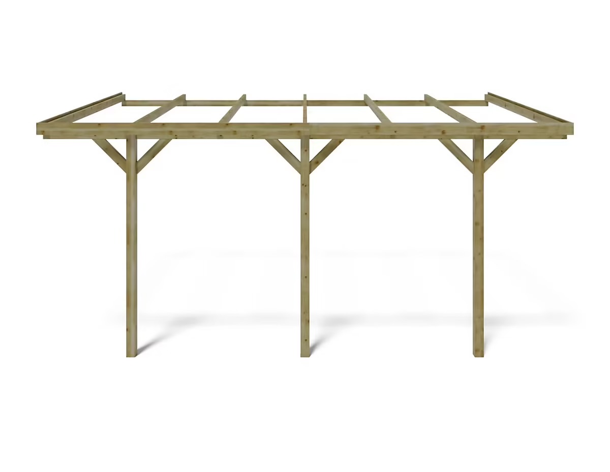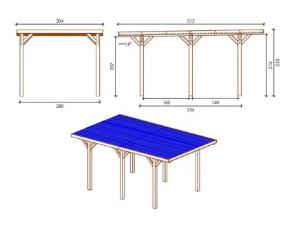 Das Carport CAR10PVCTR mit einer Breite von 3,04 m, einer Tiefe von 5,12 m und einer Einfahrtshöhe von 2,07 m kann als Carport oder beispielsweise als Terrassenüberdachung genutzt werden. Es ist aus Fichtenholz gefertigt und wurde mit Produkten der Marke KORA im Vakuumdruckverfahren imprägniert (eines der haltbarsten und effektivsten Verfahren). TECHNISCHE DATEN: Grundfläche (m): 2,8 Grundfläche (m): 5,12 Innenbreite (m): 2,56 Innentiefe (m): 5,12 Lichte Höhe (m): 2,07 Wandhöhe (m): 2,33 Firsthöhe (m): 2,33 Gesamtbreite (m): 3,04 Gesamtlänge/Tiefe (m): 5,12 Außenfläche (m²): 15,56 Innenfläche (m²): 13,11 Dachform: Pultdach Dachdeckung: PVC-Folie PVC: transparent 0,8 mm Dachfläche (m²): 15,56 Form: rechteckig Carport-Typ: freistehend Pfostenstärke (mm): 120x120 Material: Holz Behandelt: ja Schutzart: Autoklavbehandlung Farbe: grün Palettenabmessungen (Breite x Länge x Höhe cm): 120x300x35 Garantiezeit (Jahre): 2. Holzart: Kiefer. LIEFERUMFANG: - Schraubensatz für die Montage - Montageanleitung - PVC-Abdeckung. HINWEIS: Boden- und Wandbefestigungen sind nicht im Lieferumfang enthalten (müssen separat erworben werden). (!) Das Produkt kann verklebte Elemente enthalten, z. B. mit Fingerzinkenverbindungen oder anderen Klebstoffen. * Die gezeigten Bilder dienen nur der Veranschaulichung. Layouts, Farben, Pläne und fertige Projekte auf der Website dienen lediglich Informationszwecken.