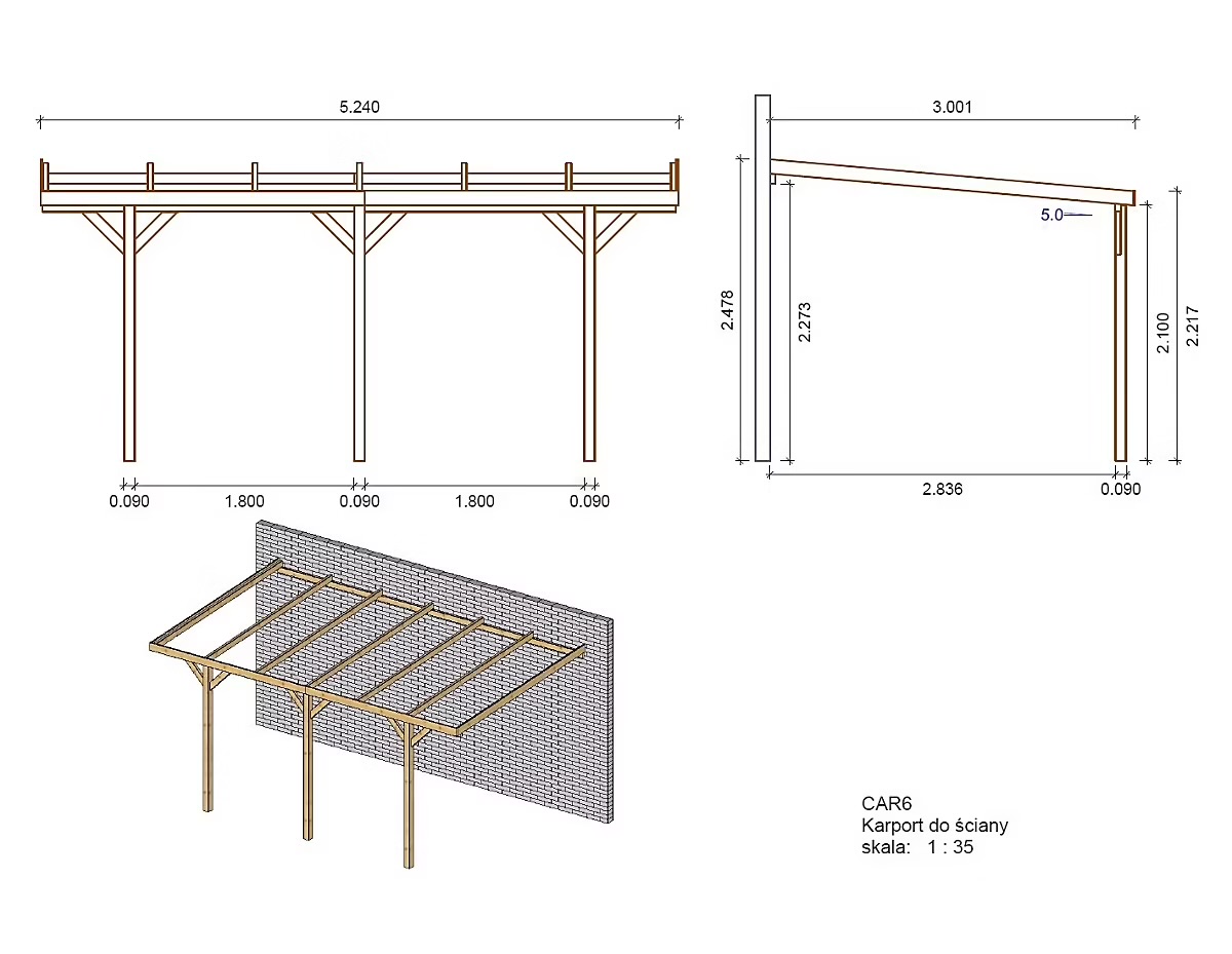 Carport, Unterstand 3×5,24 m – 15 m² – angebaut – CAR6